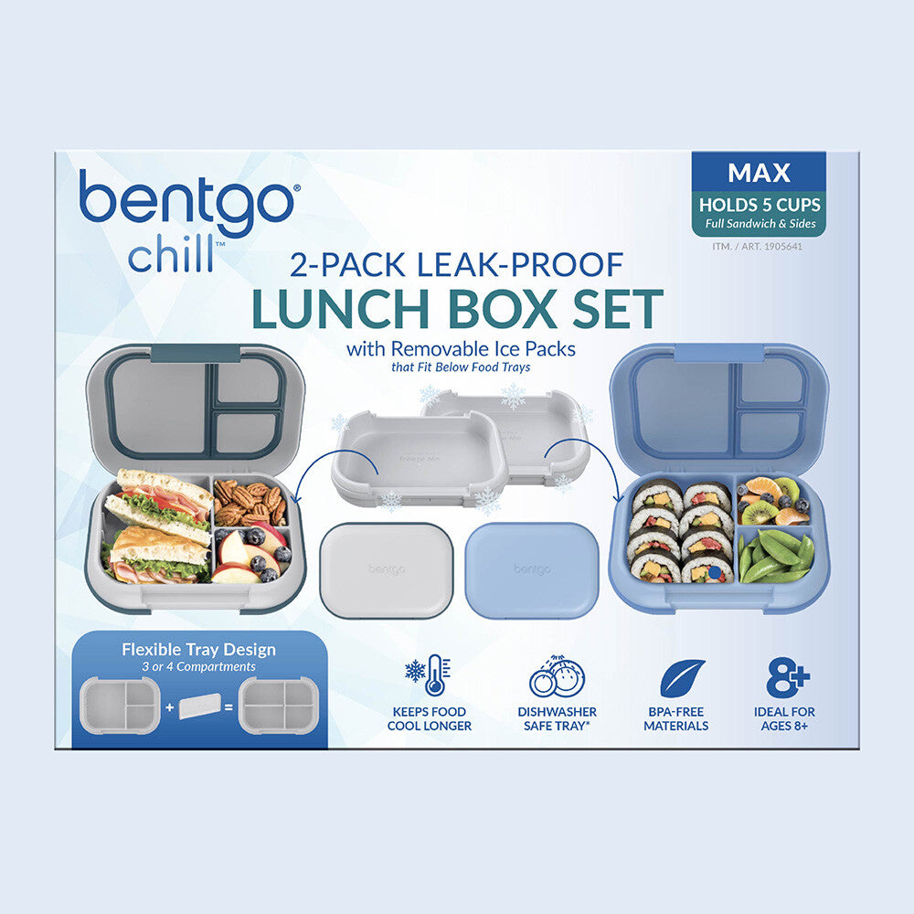 Go bigger with Bentgo Chill Max – now in a 2-pack! This extra-large 5-cup bento-style lunch box is perfect for kids 8+, teens, and adults who need more space for meals and snacks. The built-in ice pack fits neatly under the tray to keep food fresh and cool for hours. A leak-proof lid and secure clip ensure mess-free portability, while the adjustable divider lets you create 3 or 4 compartments for easy meal customization. With two in a set, it's perfect for families packing multiple lunches or anyone who wants to prep an extra meal in advance! Made with durable, BPA-free materials, it’s microwave, dishwasher, and freezer safe for effortless use every day.